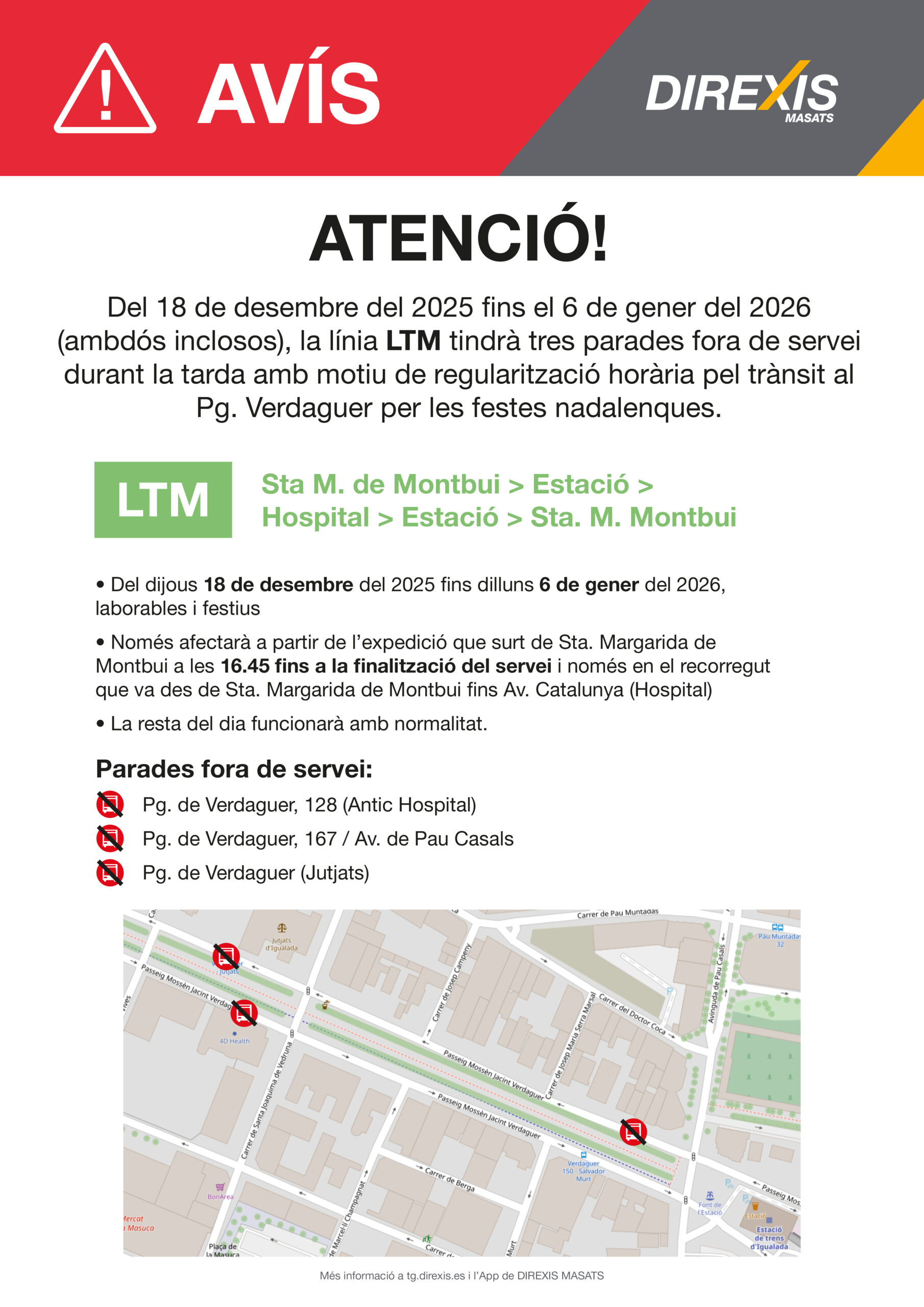 Del 18 de desembre fins al 6 de gener, la línia LTM tindrà tres parades fora de servei durant la tarda per regularització horària a causa del trànsit al Pg. Verdaguer per les festes nadalenques.